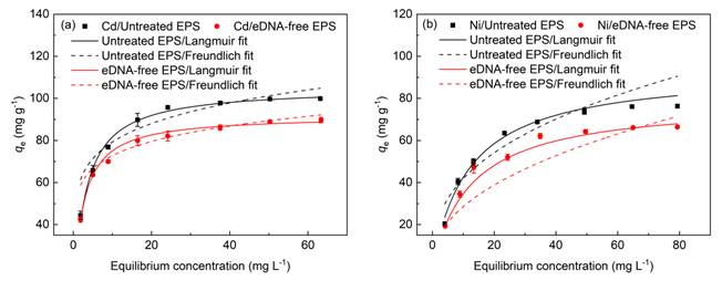 为此,彭堂见老师联合中南大学曾伟民教授团队针对胞外DNA在重金属吸附过程中的作用及机制开展了相关研究。首先采用DNA酶去除了胞外多聚物中的胞外DNA,结果发现,当去除了胞外DNA后,采用等温吸附模型可以发现胞外多聚物吸附镉离子和镍离子的能力显著下降。