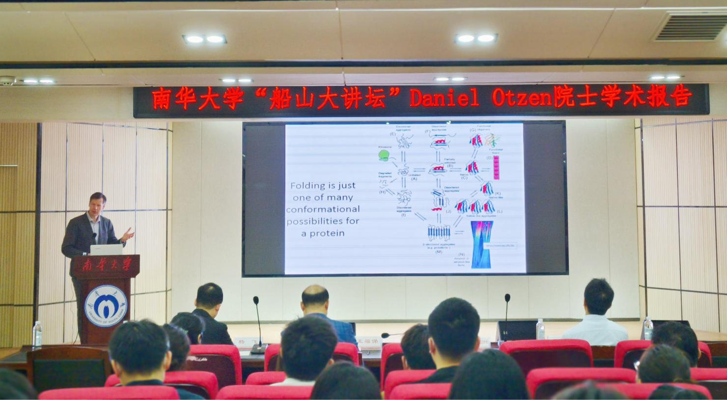 Daniel Otzen以“Functional amyloid in bacteria: friend, foe or fellow folder”为题,深入浅出地为到场师生呈现了一场精彩的知识盛宴。他分享了功能性淀粉样蛋白方面的前沿的科学问题,从蛋白的聚合与疾病的关联出发,深入阐释了细胞及细菌中功能性淀粉的聚集及折叠机制,以此筛选了功能性淀粉样蛋白肽链上的靶点,设计了抗聚集多肽,为抑制蛋白质聚集指明了方向。Daniel Otzen的研究对解决阿尔茨海默氏症等脑神经疾病具有重大的意义。