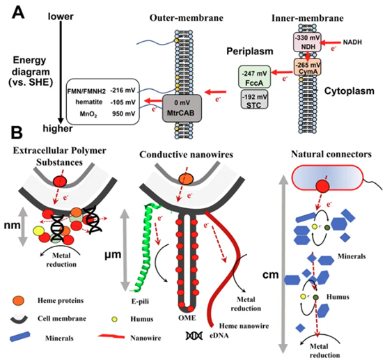 图1:天然生物地球电池(Biogeobattery)的原理示意图。(A) 法国南部石油泄漏导致的生物地球电池自然电位异常。(B) 通过纳米导线和Fe2O3形成的长距离电子传递网络。