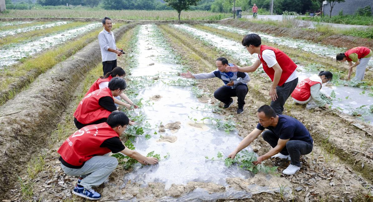 图为志愿者在学习为西瓜苗压土正枝