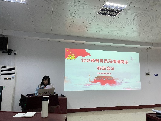 会议第一项,预备党员汇报有关情况。向煜、陈果、赵湘玲、冯倩倩、金慧云、王亚婷、邓蒸蒸七位同志从生活、工作以及入党动机等方面总结了自己的个人情况,表达自身对党组织靠拢强烈愿望,并均表示如果成为一名正式中国共产党员,一定以党章党规严格要求自己,做出模范带头作用。
